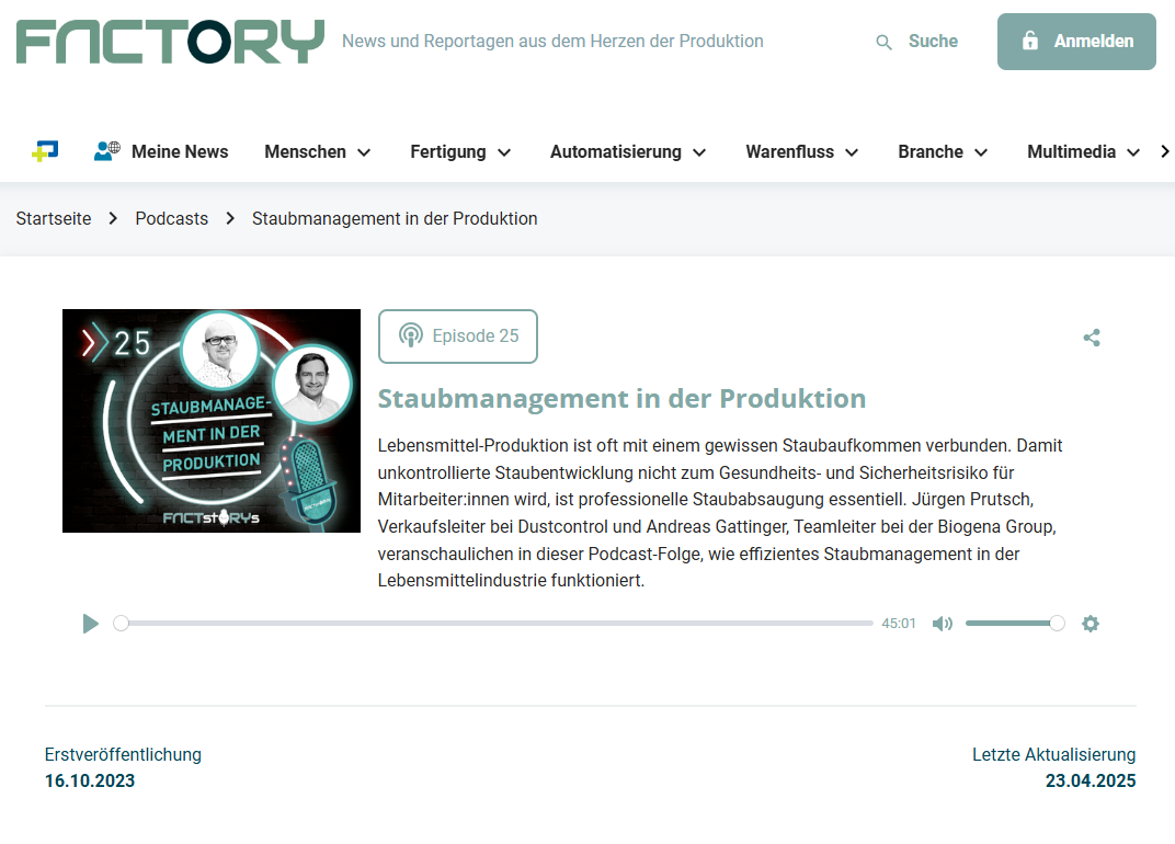 Podcast Folge mit der Factory dem Fachmagazin Posted on 20 October, 202323 October, 2025 by “Die Produktion von Lebensmitteln ist oft mit einem gewissen Staubaufkommen verbunden. Damit unkontrollierte #Staubentwicklung nicht zum Gesundheits- und Sicherheitsrisiko für Mitarbeiter:innen wird, ist professionelles Absaugen essentiell. Jürgen Prutsch, Verkaufsleiter bei Dustcontrol Österreich und Andreas Gattinger, Teamleiter bei der BIOGENA GROUP, veranschaulichen in dieser #Podcast-Folge, wie effizientes Staubmanagement in der Lebensmittelindustrie funktioniert.” Wir freuen uns dabei gewesen zu sein! 😄 Zusammen mit unserem Kunden von der Biogena Group Andreas Gattinger und unserem Verkaufsleiter Jürgen Prutsch haben wir uns mit dem Thema Staubmanagement in der Produktion befasst.Warum nicht reinhören und mehr erfahren! Mit einer kompakten zentralen Absauganlage von Dustcontrol können deutliche Einsparungen erzielt werden. Beispielsweise können alle Schleifund Fräsmaschinen in einer Produktionseinrichtung mit Saughauben ausgestattet und an ein zentrales Absaugsystem angeschlossen werden. Die Staubabsaugung an der Quelle trägt zu einer besseren Arbeitsumgebung, höherer Produktivität, kürzeren Reinigungszeiten, mehr Sauberkeit und erhöhter Produktqualität bei. Wir bieten Vakuumerzeuger, Punktabsaugung, Filtereinheiten, Überkopfreinigung und mobile Einheiten an. Das Besondere bei uns ist, dass unser Projektleiter und ganzes Team eine individuelle Lösung finden können. Unser Motto ist vor allem langlebige Absaugungen zu produzieren. Falls Sie lieber selber sich schlau machen wollen, schauen Sie doch einfach bei unserer Auswahlhilfe vorbei. In der Lebensmittelindustrie gibt es besondere Anforderungen. Die Kontrolle, der in der Produktion eingesetzten Komponenten und Geräte ist sehr aufwendig, wobei das Risiko einer Übertragung, die Oberflächenbeschaffenheit und antistatische Eigenschaften zu berücksichtigen sind. Dustcontrol bietet komplette Punktabsaugungssysteme für die Lebensmittelindustrie. Jedes System ist einzigartig, einige Systeme wurden in der Zone 22 entsprechend den ATEX-Richtlinien 2014/34/EU installiert. Bisher haben wir uns vor allem auf Reinigungs- und Absaugsysteme im „schmutzigen“ Teil der Lebensmittelproduktion konzentriert, für den es in der Regel geringere Anforderungen an die Hygiene gibt. Mit unseren speziellen Saugbürsten und einem kompletten Punktabsaugungssystem, das ausschließlich aus für den Kontakt mit Lebensmitteln bestimmten Materialien besteht, haben wir eine neue und spannende Lösung, die zudem mehrere marktführende Funktionen umfasst. Dadurch haben wir die Möglichkeit, gemeinsam mit dem Kunden eine Lösung für vollständig in den Produktionsprozess integrierte Systeme zu finden, die die Wiederaufbereitung und viele andere Funktionen umfassen. Dustcontrol entwickelt und installiert komplette Punktabsaugungssysteme in enger Zusammenarbeit mit dem Kunden. Unsere Absaugsysteme können zur optimalen Wiederaufbereitung vollständig in den Produktionsprozess integriert, oder als effizientes und sauberes zentrales Staubsaugersystem eingesetzt werden. Mit anderen Worten: Sie sind für Lebensmittel geeignet.Danke an Herrn Dennis Rathmann für die tolle Moderation.#factoryfachmagazin #dustcontrol #lebensmittelindustrie https://factorynet.at/podcasts/staubmanagement-in-der-produktion/: Podcast Folge mit der Factory dem Fachmagazin Mehr in News Möchten Sie Hilfe bei der Sicherung Ihres Arbeitsplatzes? 22 Apr, 2025 Saughauben für sicheres Arbeiten: Effektive Staubkontrolle bei Bauarbeiten 24 Mar, 2025 Was ist eine Staubexplosion? | Alles, was Sie über brennbaren Staub wissen müssen 05 Feb, 2025 Industriesauger der Verwendungskategorie H 07 Jan, 2025 Gesundheit, Sicherheit und Hygiene im Pharmasektor 09 Dec, 2024